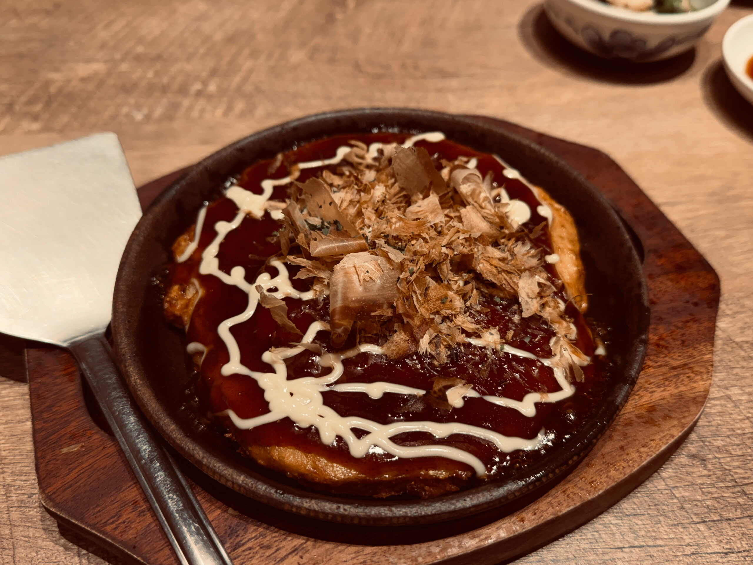 Különleges élményünk volt továbbá az Okonomiyaki, amit sokan japán palacsintaként emlegetnek, bár inkább egy sós, tartalmas egytálétel. Káposztával kevert tésztából készül, amit húsokkal, tengeri herkentyűkkel vagy akár sajttal egészítenek ki, majd vaslapon sütnek meg. A tetejére édeskés okonomiyaki szósz, majonéz és bonitopehely kerül és az egész egyszerre laktató, látványos és elképesztően finom, Tokióban igazi komfortételnek számít.