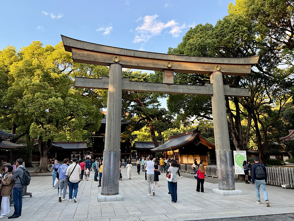Ezzel ellentétben teljesen más hangulatot áraszt a Meidzsi-szentély, amely Tokió közepén áll, mégis egy sűrű, csendes erdő veszi körül. A szentélyt Meidzsi császár és felesége emlékére építették és tökéletesen tükrözi a sintó vallás természetközpontú szemléletét. A hatalmas torii kapukon áthaladva valóban úgy éreztük, mintha egy másik világba lépnénk, ahol a város zaja egyszerűen megszűnik.