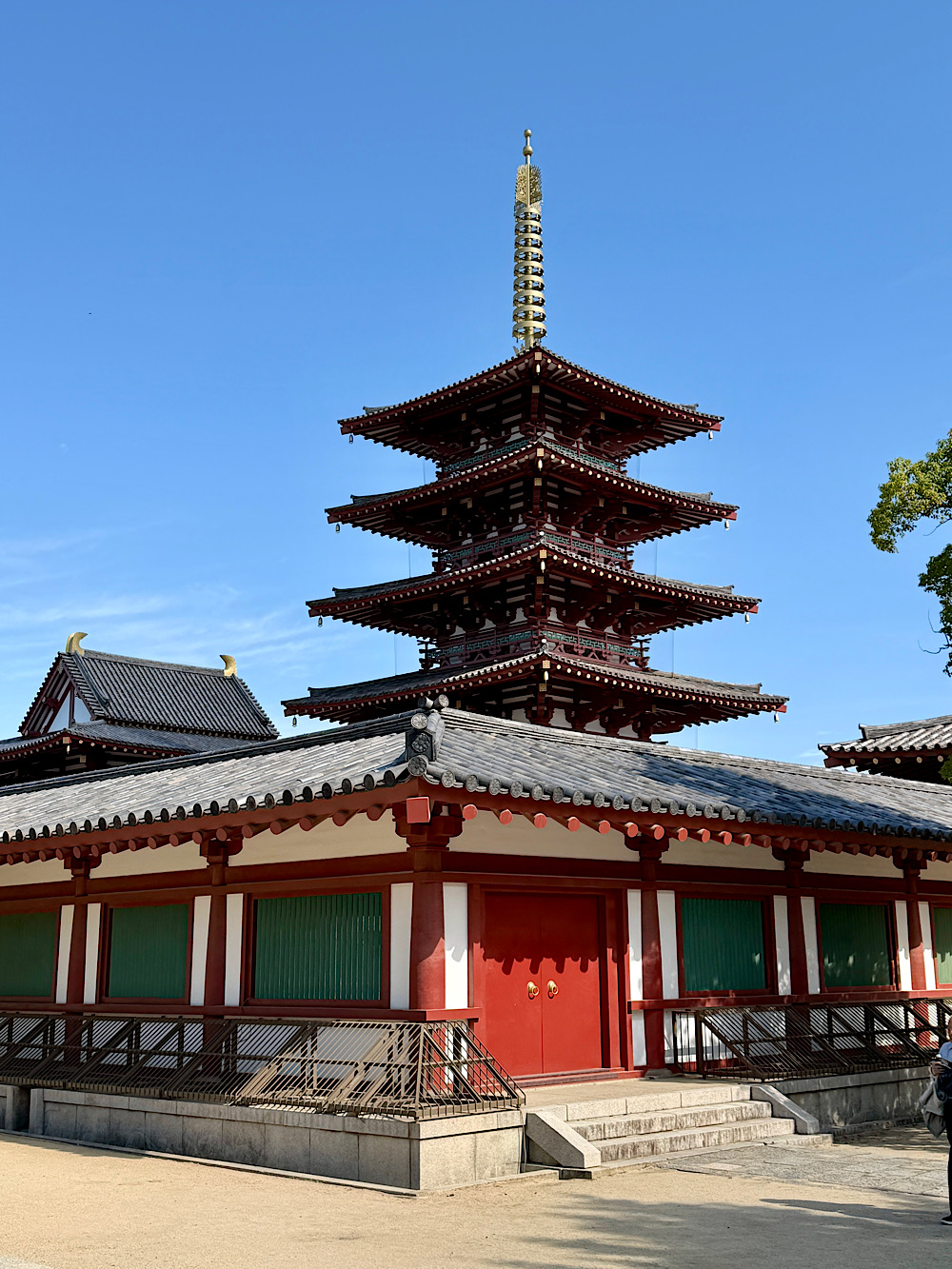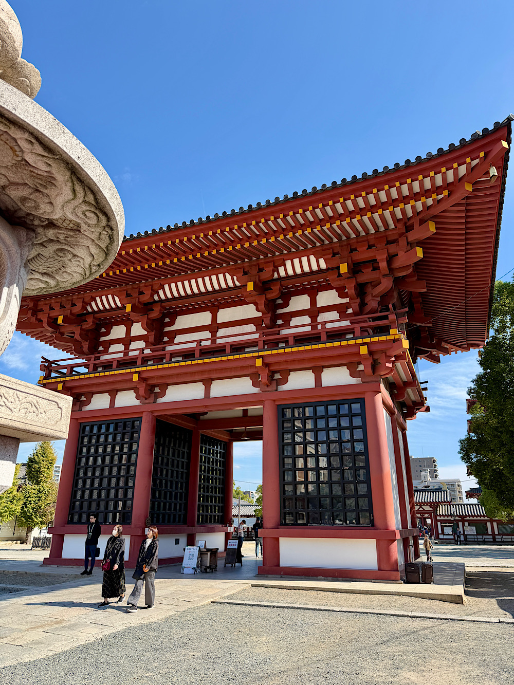 A Shitennō-ji templom Oszaka egyik legkülönlegesebb történelmi helyszíne, hiszen Japán legelső hivatalos buddhista templomaként tartják számon, amelyet 593-ban alapított Shōtoku herceg. Már a bejáratnál érezhető az a csend és a nyugalom, amely éles ellentétben áll a város nyüzsgésével, így ahogy beléptünk, szinte azonnal egy másik világban találtuk magunkat. A templom különlegessége, hogy bár az évszázadok során többször újjáépítették, minden alkalommal hűek maradtak az eredeti, VI. századi stílushoz, így ma is pontos képet kaphatunk arról, milyen lehetett az ősi japán buddhista építészet.