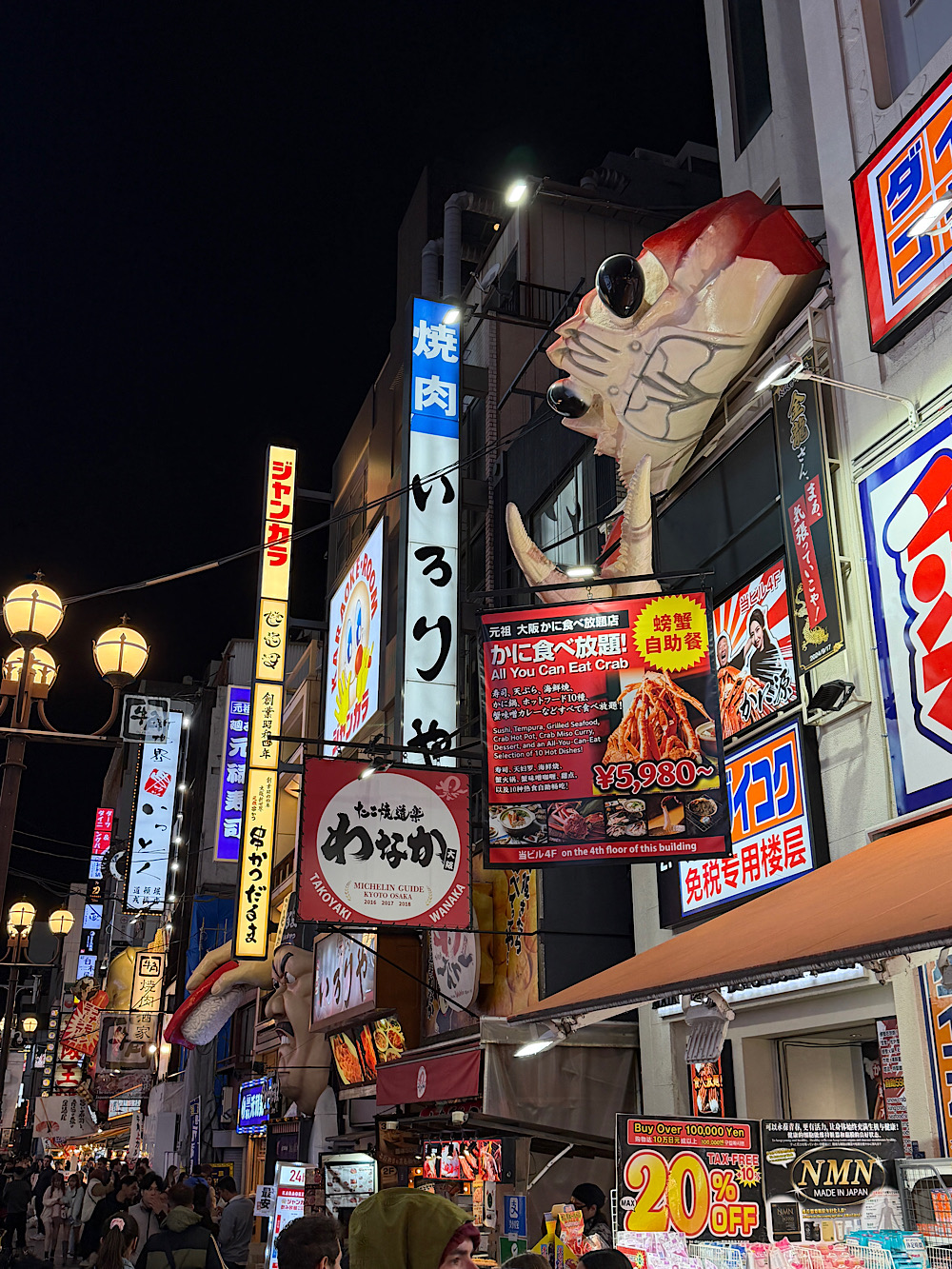 Nem is kezdhettük volna máshol a legelső oszakai reggelünket, mint a közeli Kuromon piacon, ahol tényleg minden megtalálható. Már a belépés pillanatában beszippantott minket a nyüzsgés, az illatok és a friss tengeri herkentyűk látványa, amelyek minden standnál újabb és újabb kóstolásra csábítottak minket. Kipróbáltunk szinte mindent. Rákot, polipot, tintahalat, kagylót és természetesen nem hagyhattuk ki a frissen készült takoyakit sem. A piac hatalmas és a szuvenírek mellett megszámlálhatatlan ételstand sorakozik itt, így a vásárlás és a kóstolás egyszerre válik élménnyé. Külön élveztük a különböző tengeri nyársakat és az óriásrákot, amelyet frissen készítettek el előttünk. Ezek az ízek tökéletesen megalapozták az oszakai tartózkodásunk hangulatát és az az napi hangulatunkat is.