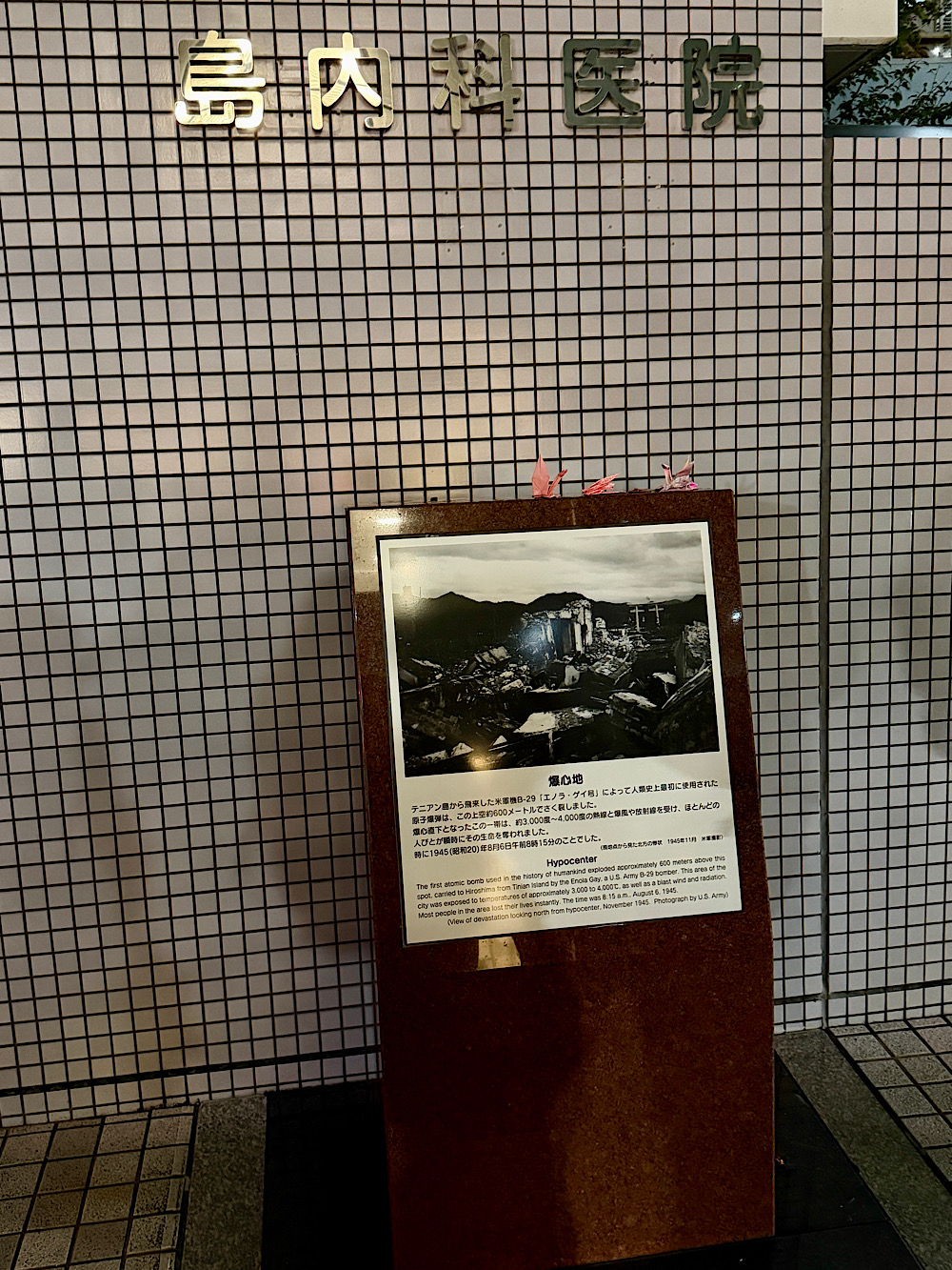 1945. augusztus 6-án reggel 8:15-kor az amerikai Enola Gay B–29-es bombázó ledobta a „Little Boy” nevű atombombát Hiroshima fölött. A bomba mintegy 600 méterrel a város felett robbant fel, hogy a pusztítás minél nagyobb területet érjen el. A körülbelül 15 kilótonnás robbanás egyetlen vakító villanással és pusztító lökéshullámmal semmisítette meg a város központját. Az épületek mintegy 70%-a teljesen elpusztult, a többi súlyosan megrongálódott. Ezrek haltak meg azonnal, sokakat pedig a hő, a tűzvihar és az összeomló szerkezetek temettek maguk alá.
